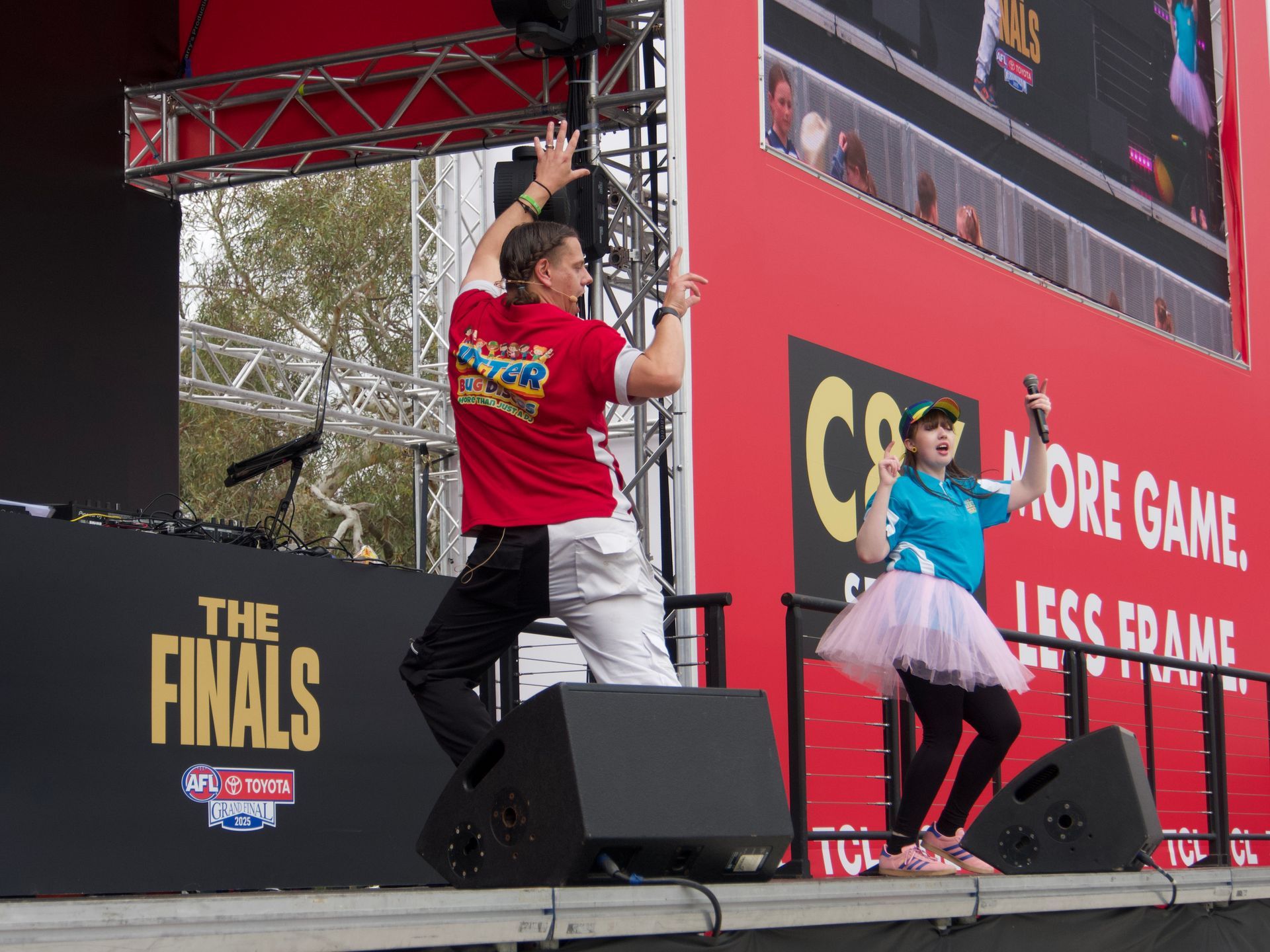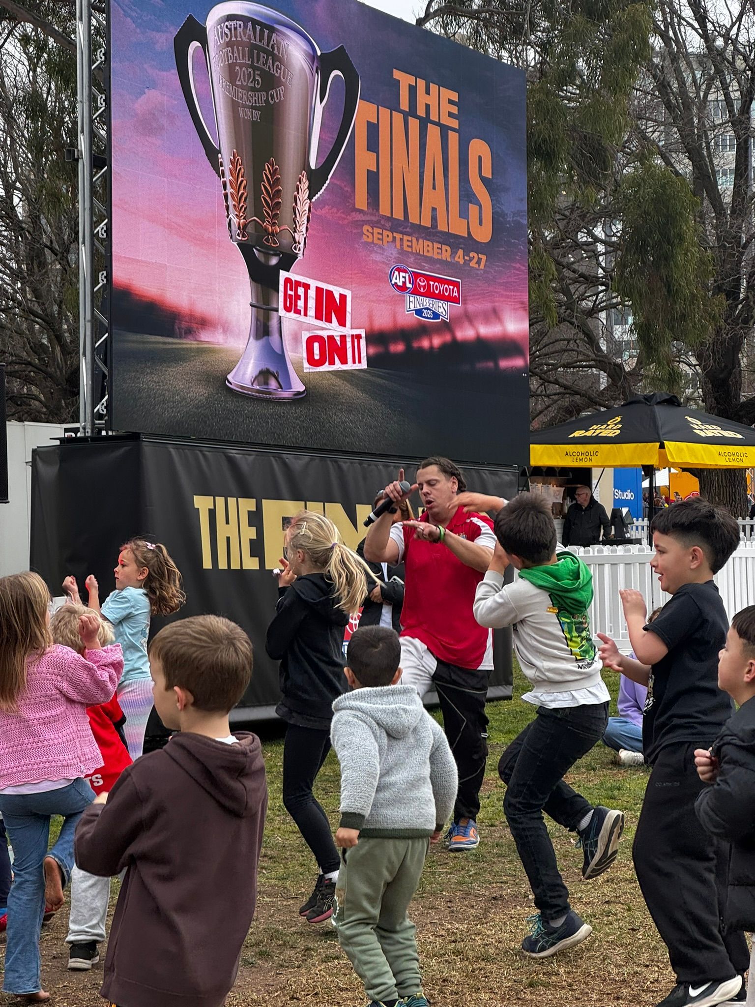 DJ Jitter Bug and Lexi delivered three high-energy sets at the AFL Grand Final Festival, one of Australia’s biggest sporting and entertainment events, sharing the stage with headline acts like Snoop Dogg. Families, kids, and footy fans all joined in for interactive games, sing-alongs, and dance routines, creating an unforgettable atmosphere full of energy and laughter. A highlight was our custom Grand Final mash-up remix, made just for the occasion — it had everyone moving! Showcasing our signature KDM style, Jitter Bug Discos proves why we’re Melbourne’s go-to kids DJ, bringing unforgettable, family-friendly disco experiences to schools, parties, and events across the city.
